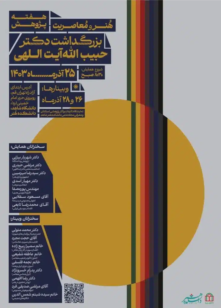 دانشکده هنر دانشگاه شاهد برگزار می کند: هفته پژوهش با موضوع: هنر و معاصریت بزرگداشت مرحوم« دکتر حبیب‌الله آیت‌اللهی » یکشنبه – ۲۵ آذرماه 1403 آمفی‌تئاتر دانشکده هنر شاهد ساعت ۸:۳۰ صبح تاریخ وبینار‌ها 26 و 28 آذرماه همراه با نمایشگاه تالیفات و آثار پژوهشی استادان و معرفی مجله علمی دانشکده هنر شاهد