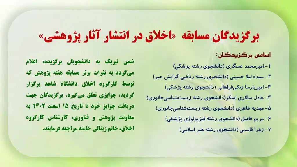 به همت کارگروه اخلاق در پژوهش دانشگاه شاهد و معاونت پژوهشی مسابقه «اخلاق در انتشار آثار پژوهشی» برگزار شد.