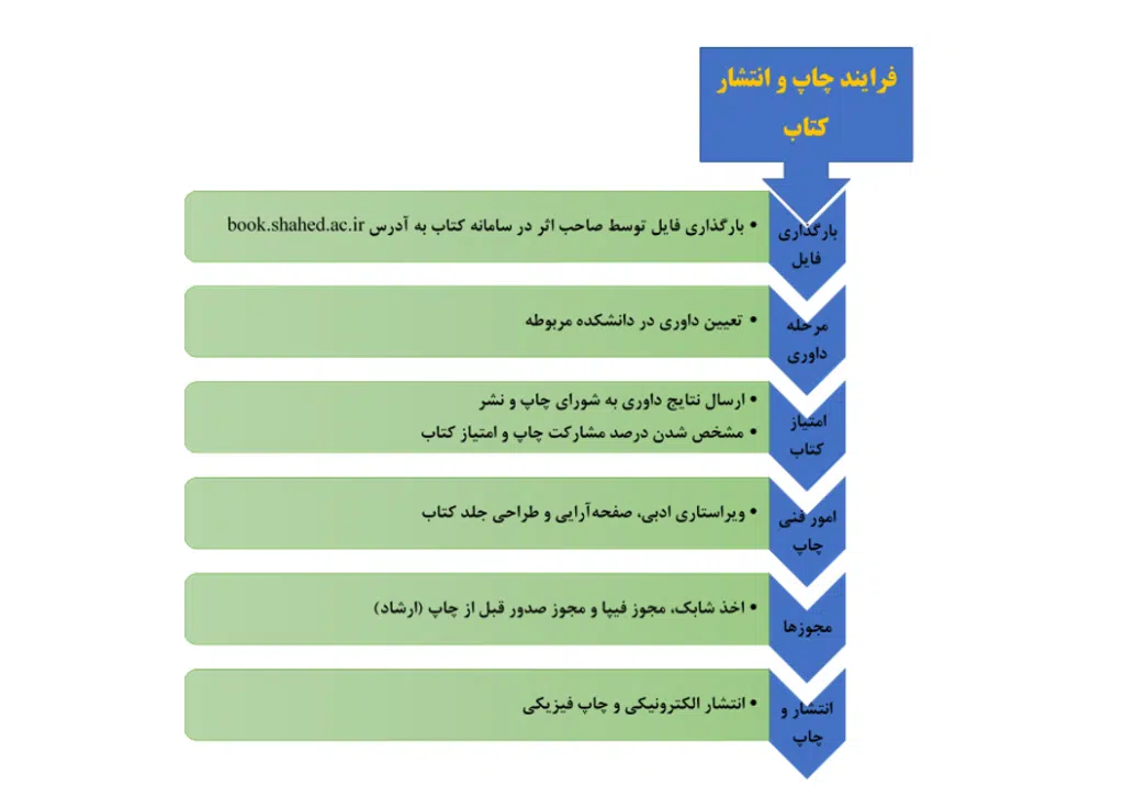 فرایند انتخاب کتاب از طریق سامانه کتاب اداره انتشارات book.shahed.ac.ir صورت میپذیرد و عضو هیئتعلمی محترم پس از ثبتنام در این سامانه و بارگذاری فایل اولیه اثر، درخواست کاربر بهصورت خودکار به پنل معاونت پژوهش و فناوری دانشکده مرتبط ارسال میشود. پس از تعیین داوران تخصصی مرتبط توسط دانشکده، اثر موردنظر وارد فرایند داوری شده و بعدازاین مرحله، نتایج داوری از طریق سامانه مذکور به شورای چاپ و نشر ارجاع داده میشود. انتخاب کتاب جهت قرارگیری در فرایند چاپ و نشر، توسط شورا طبق نظرات داوری در این مرحله انجام خواهد گرفت. پس ازنظر مساعد شورا و تعیین امتیاز مشارکت در چاپ، اثر ارسالی در فرایندهای قبل از چاپ قرارگرفته و بعد از اخذ مجوزهای لازم، کتاب چاپ خواهد شد.