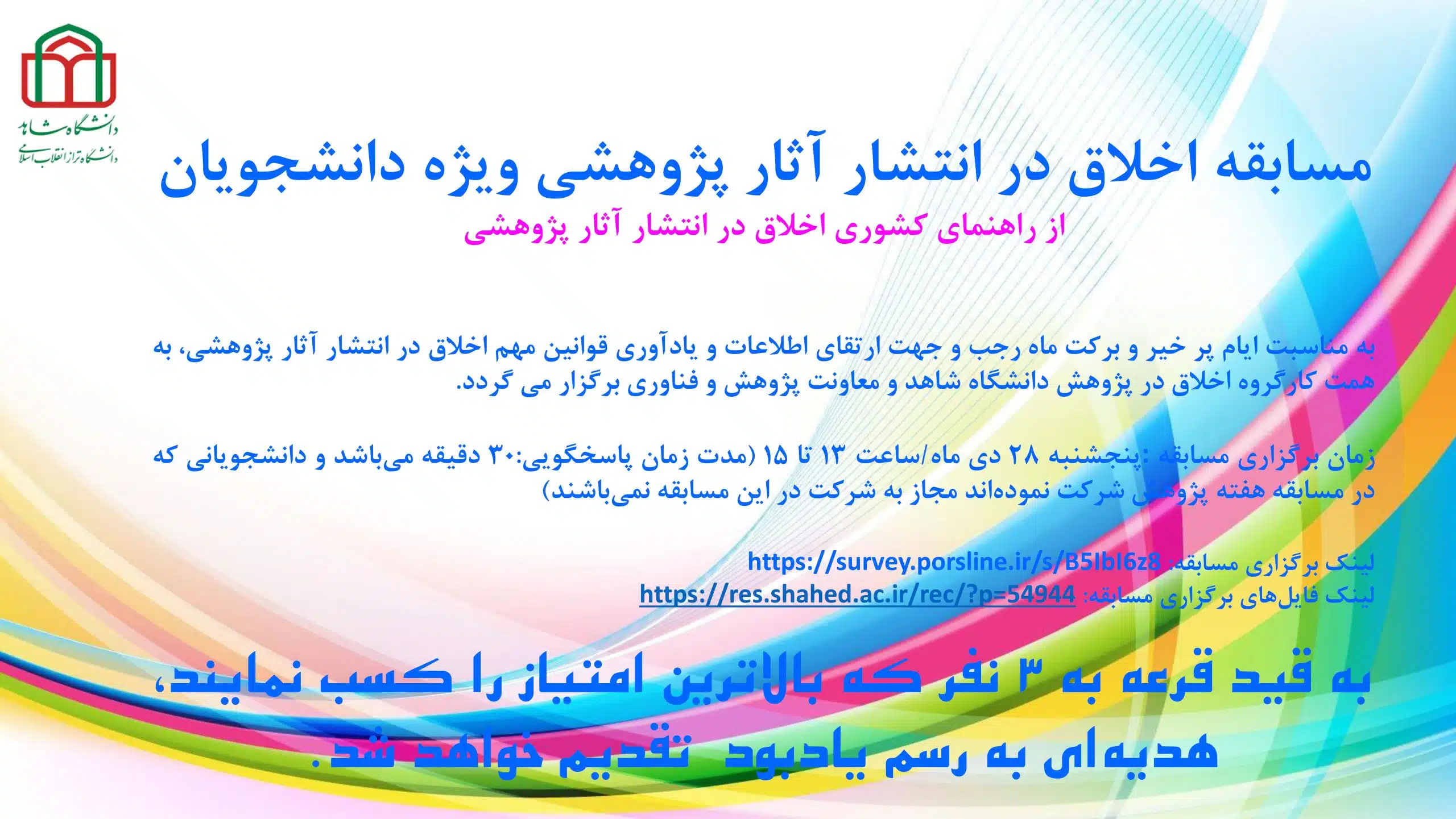 به مناسبت ایام پر خیر و برکت ماه رجب و جهت ارتقای اطلاعات و یادآوری قوانین مهم اخلاق در انتشار آثار پژوهشی، به همت کارگروه اخلاق در پژوهش دانشگاه شاهد و معاونت پژوهش و فناوری برگزار می گردد.